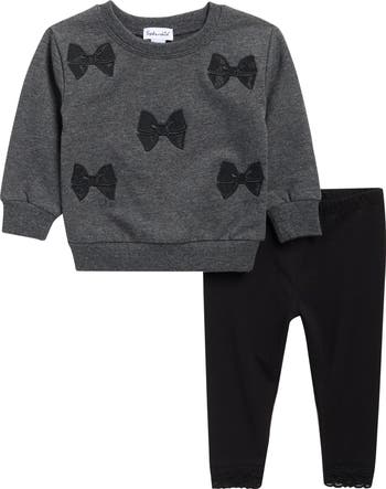 Charming bow appliqués add adorable whimsy to a cotton-blend sweatshirt paired with lace-trimmed leggings to keep baby sweet and cozy.