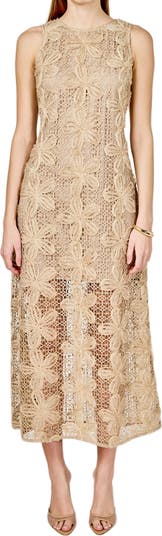 A lacy floral overlay heightens the retro charm of this airy sleeveless dress in an A-line silhouette.