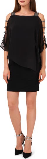Twinkling rhinestones detail the straps and sleeves of this every-ready minidress finished with a free-flowing cape for graceful animation.