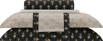 - The strict and stylish gold ornament on black fabric is a reference to the luxurious Art Deco era with its geometry of lines and shapes