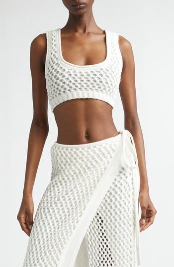 A variety of jet-black beads glint from this mesh-stitch sweater-bralette knit with a deep U-shaped neckline.