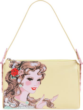 The London designer takes cute and kitsch to spellbinding proportions in this smooth leather shoulder starring a purdy lady flanked by hinge hardware.