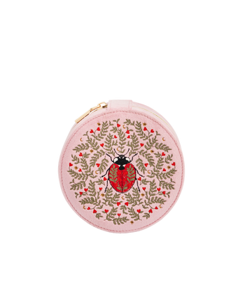 Keep your treasures safe in style with our Pink Ladybird Velvet Embroidered Circle Jewellery Box. Crafted in soft velvet and adorned with our signature ladybird embroidery, synonymous with the Freya collection, this elegant piece is finished with gold-toned hardware. Inside, it opens to reveal two compartments and dedicated ring stackers, making it the perfect size for graceful bedroom storage or stylish travel.