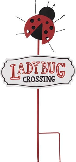 Add a whimsical touch to your outdoor haven with this charming garden stake. The ladybug motif brings a sense of luck and joy to your space, featuring a prominent white sign proudly displaying "Ladybug Crossing". This garden stake comes with pointed feet that have been thoughtfully designed to allow for seamless and effortless ground staking. Product Features: Sign reads "Ladybug Crossing" in red and black letters Red metal stake attached For outdoor use only Dimensions: 23"H x 11"W x .5"D Material(s): metal