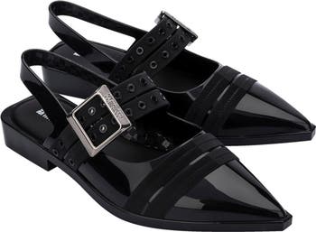 An oversized buckle and grommet-enriched mary jane straps add an edgy aesthetic to a pointy-toe slingback flat infused with the brand's signature fruit scent.