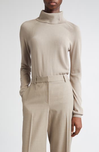 An essential turtleneck sweater is knit from a lightweight, oh-so-soft yarn blend that adds casual charm with its raglan-sleeved design.