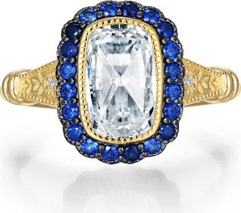 An art-deco aesthetic animates a sparkling statement ring, wrapped in filigree and set with a simulated-diamond center stone framed in simulated sapphires.