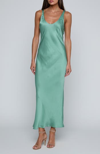 Go for elevated minimalism in this figure-grazing slipdress cut from lustrous satin with a tank silhouette and an ankle-grazing hem. A slightly angled inset at the bottom provides a subtle flutter to your step.