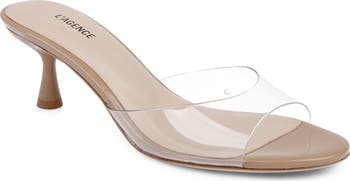 A translucent upper adds futuristic flair to a minimalist slide sandal grounded by a foam-cushioned footbed and cylindrical heel.