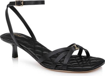 Signature logo hardware center the lizard-embossed leather straps on a minimalist sandal grounded by a cushioned footbed and trend-right kitten heel.