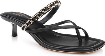 Chain-link hardware gleams along the slender instep strap on a square-toe sandal fashioned with a stylish toe ring and lifted by a tapered kitten heel.