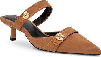 Etched hardware buttons add a regal aesthetic to a stylish denim mule framed by a pointy toe and tapered kitten heel.