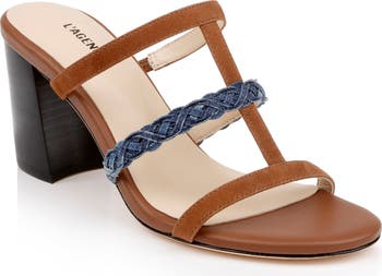 Woven and smooth straps create textural interplay on a poised slide sandal grounded by a cushioned footbed and stacked heel.