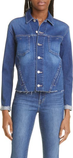 Strategic fading and a shapely silhouette define a denim jacket left with raw hems and cuffs for a bit of modern edge.