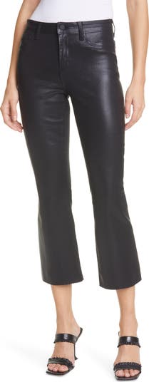 High-recovery denim perfects the fit and longevity of these cropped flare jeans made with a glossy coating and finished with raw-edged hems.