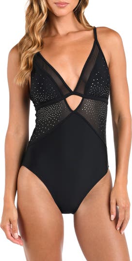 Gleaming rhinestones give a wet look to this splash-ready swimsuit with a mix of sheer and opaque panels for extra flirty energy. It gets extra support from stretchy powermesh for a shaping fit.