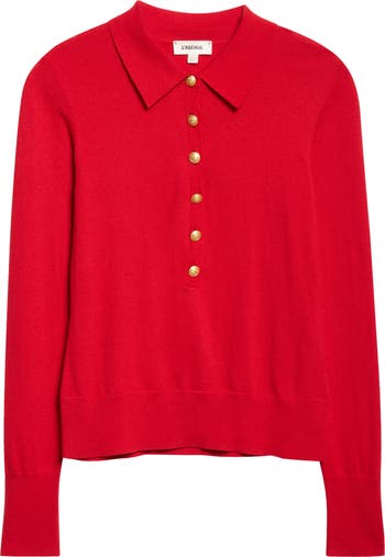 Silvery ornate buttons march down the front of this fine-gauge sweater knit with a polished collar.