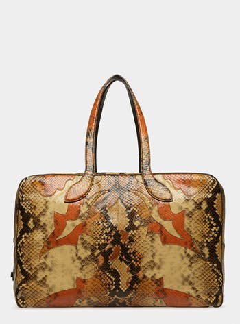A smaller weekender bag perfect for getaways and daily city life, this printed python leather style features comfortable handles and luxurious leather lining. Inside, pockets allow for easy organization.