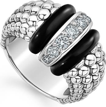 Glossy black ceramic and a luminous pavé diamond station create a delightful study in contrasts on this ring handcrafted with tactile sterling silver beads.