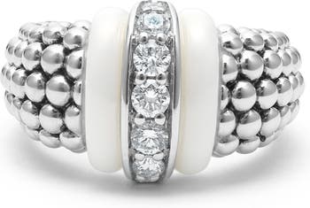 Ceramic discs and Caviar beading give a bubbly gloss to this sterling silver ring centered by pavé diamonds.