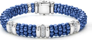 Caviar-beaded ceramic in a striking blue hue creates gorgeous texture in this rope bracelet lit up with three pavé diamond stations.