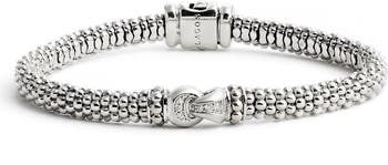 Glittering white diamonds and solid-gold accents highlight the decorative links at the center of this slinky, slender bracelet handcrafted from LAGOS' signature sterling-silver beadwork.