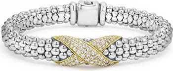 A center 18-karat-gold X-station adorned with sparkling pavé diamonds gives signature sparkle to a Caviar-beaded bracelet forged from stunning sterling silver.