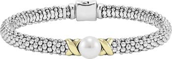 Crisscrossed 18-karat-gold stations frame the lone freshwater pearl lustrously starring on a slender sterling-silver bracelet of tactile Caviar™ beads.