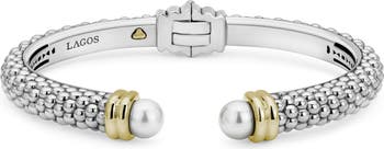 Luminescent pearl endcaps with 18-karat-gold accents add to the opulent look of this hinged bracelet in a signature caviar-beaded design.