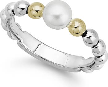 An elegant addition to a well-curated ring stack, this sterling band of signature caviar beading showcases a luminous pearl framed with 18-karat-gold accents.