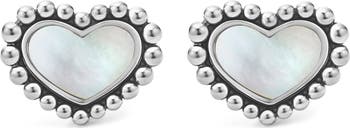 Beautiful color shines from the Caviar-framed stone inlays on these elegant sterling silver heart earrings.