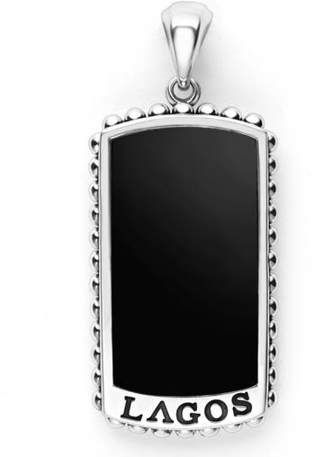 A smooth black agate center boldly contrasts with the sterling silver Caviar-beaded frame on this statement-making tag amulet completed with a Krunch emblem on the back.