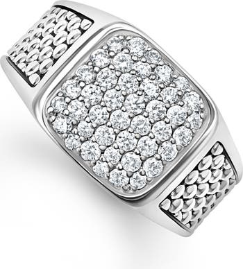 Signature Caviar beading textures the shank of this sterling silver signet ring glinting with pavé diamonds.