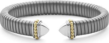 Contrasting 18-karat-gold Caviar beading frames the structured ends of this sterling silver cuff bracelet.