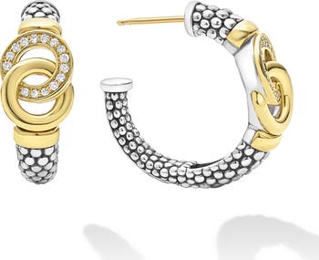 Interlocking circles with diamond accents bring warm light to these stunning Caviar-beaded hoop earrings crafted from polished sterling silver.