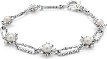Cultured pearls encircled by Caviar beading create a dynamic floral motif stationed along this sterling silver bracelet.
