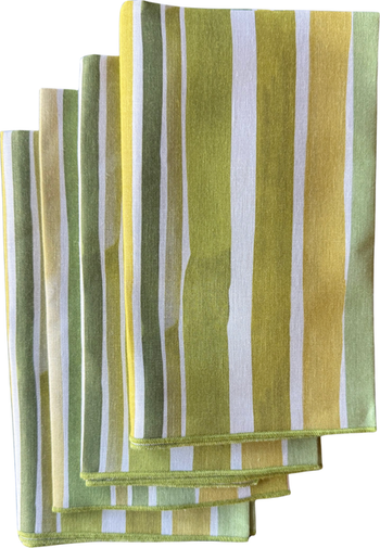 Set a beautiful table with our New Lagos Stripe. Hand-painted in a myriad of green, mustard and yellow tones, this print makes a beautiful foundation for a festive, statement-making table. Pair with the matching placemats, runner, or tablecloth or mix + match with the Green Marble or Porto in Olive linens for a super cool aesthetic. 18x18 inches; set of 4 100% European linen Designed in NYC, Made in Portugal Machine wash cold, lay flat to dry. Iron or dry clean optional.