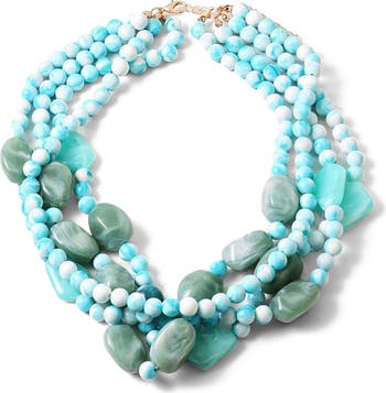 Features layered strands of soft turquoise and sky-blue beads paired with smooth sea-glass inspired stones in calming ocean hues. The mix of shapes and textures creates a bold yet effortless look that feels playful, artistic, and unmistakably coastal.