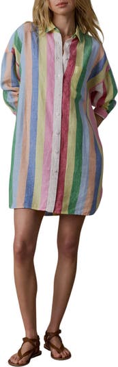 Settle into the laid-back vacay vibes of this relaxed long-sleeve shirtdress crafted with light, breezy linen and patterned with crisp stripes.