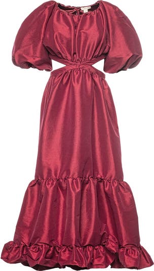 Laila Maxi Dress in Carmine features dramatic puff sleeves, adding a touch of drama and a nod to vintage charm. A daring cut-out waist and a criss-cross front waist detail create a flattering silhouette, accentuating your curves with a tasteful allure. The meticulous craftsmanship ensures a perfect fit that enhances your natural beauty. Crafted with attention to detail, the frill hem adds a playful and feminine touch, creating a mesmerizing movement as you glide through any event. The luxurious taffeta fabric not only shimmers with a subtle glow but also offers a comfortable feel against your skin.