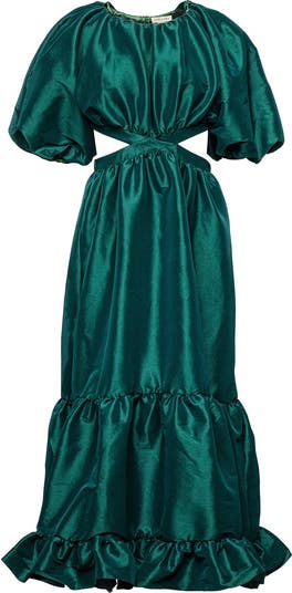 Laila Maxi Dress in Emerald features dramatic puff sleeves, adding a touch of drama and a nod to vintage charm. A daring cut-out waist and a criss-cross front waist detail create a flattering silhouette, accentuating your curves with a tasteful allure. The meticulous craftsmanship ensures a perfect fit that enhances your natural beauty.