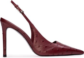 Snip toe slingback pump with a squared throat line, set on a straight stiletto heel in ostrich printed leather.