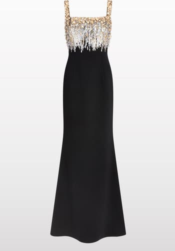 Defined by a sculpted square neckline, this gown features a striking bodice adorned with intricate embellishment that cascades elegantly into a smooth, floor-length skirt. The structured silhouette balances opulence with simplicity, creating a statement look for evening galas or formal receptions.