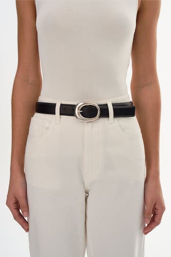 Polish your look with this classic leather belt, detailed with a sculptural gold-tone oval buckle for a refined statement. Designed to complement both relaxed denim and elevated tailoring, it adds warmth and timeless appeal.