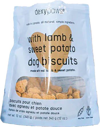 DEXYPAWS: LAMB & SWEET POTATO DOG BISCUITS - 12oz Bag - Introducing our treat series. All of our treats are soy- and corn-free and made in Canada with simple, real, and highly palatable food. These treats are perfect to use as a reward during training sessions or whenever you feel like spoiling your pup! They come in a convenient resealable 12oz bag so that your treats stay fresher and crunchier for longer. Gentle on Sensitive Stomachs: With gentle, easily digestible ingredients, these treats are ideal for dogs with sensitive stomachs or dietary sensitivities, providing a soothing and safe option for your pet. INGREDIENT BENEFITS: Loaded with fiber to support healthy digestion and encourage regular bowel movements. Packed with vitamins A and C to strengthen immune function. Features antioxidants that may contribute to overall health and well-being. Flavorful and palatable ingredients. INGREDIENTS: Barley, Cane Molasses, Lamb, Sweet Potato, Rolled Oats, Parsley, Rosemary Extract, Mixed Tocopherols. MADE IN CANADA: Proudly produced in Canada with high-quality ingredients, ensuring you’re giving your dog the best.