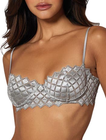 Diamond jewel embroidery meets soft silk stretch charmeuse in a balconette that lifts and shapes with effortless elegance. Sculpted cups provide support while revealing just enough, creating a fit that’s both flattering and seductive. Pair with the Lamine Embroidery Thong for a perfectly coordinated look.