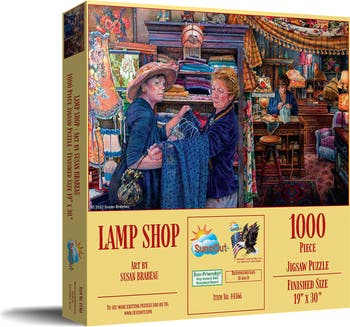 Step into a world of retro charm with the Lamp Shop 1000 Piece Jigsaw Puzzle by SunsOut. Featuring the delightful artistry of Susan Brabeau, this puzzle invites you to immerse yourself in a vibrant Americana shopping scene, offering a perfect relaxation and unwinding medium. Every piece, precision-cut and crafted from high-quality recycled cardboard, ensures a seamless and enjoyable puzzle-building experience. Our puzzles, proudly made in the USA, adhere to the highest manufacturing standards, come with a worry-free guarantee, and reflect our commitment to quality and customer service. We also take an eco-friendly approach to our products, with puzzles printed using soy-based inks and premium recycled-board that can withstand repeated use. The Lamp Shop puzzle comes in a beautifully packaged full-color display box, making it an excellent gifting choice for family, friends, or yourself. By choosing this puzzle, you not only enjoy a meaningful, artistic escape but also support SunsOut, a proud woman-owned business committed to fostering dreams and innovation.