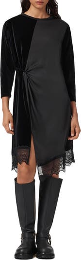You'll be ready for your next night out in this effortlessly chic mixed-media dress featuring asymmetric gathering and a lacy hem.