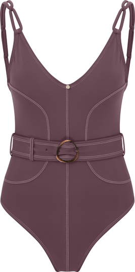 Lana Swimsuit, in a soft plum hue, the Lana Swimsuit is the most romantic design in our Swimwear collection. Its signature knotted straps and bronze belt add a sophisticated and unique touch. Whether you're styling it for the beach or the city, this piece is ready to accompany you effortlessly throughout the day | Adjustable belt at the waist | Chain detail on the straps | Removable padded cups included
