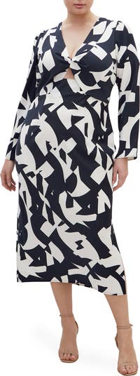 An abstract print emboldens this figure-skimming maxi updated with a deeply dipped neckline and an edgy front cutout.